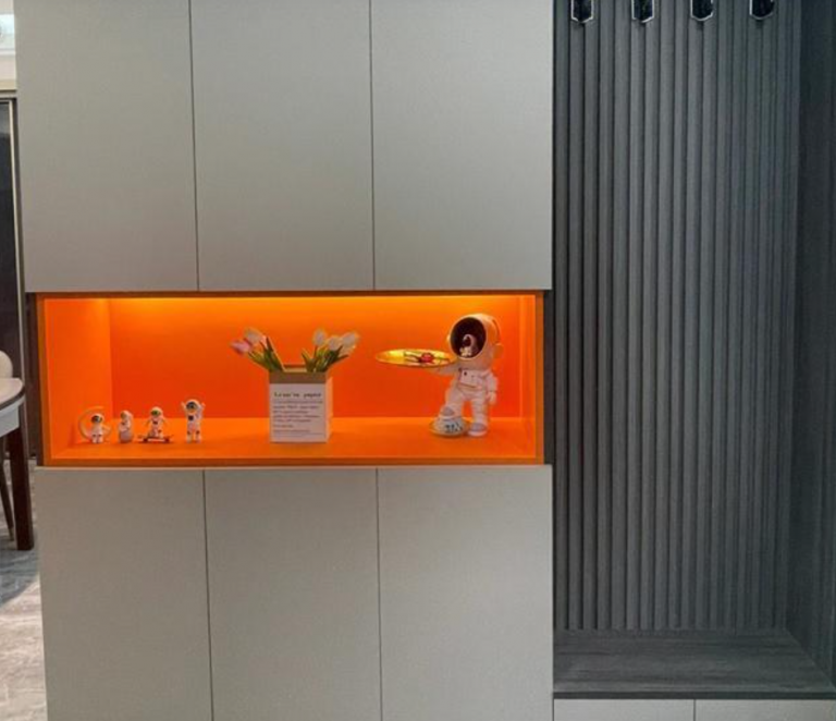裝修輕奢風格,從入戶門進來擁有獨立的玄關,根據需求設計了一個自帶換鞋凳上下兩層的鞋柜。鞋柜整個色調都是灰色,中間加了橙色的搭配,視覺上很搶眼,類似打破了整個鞋柜寧靜的感覺,讓人一進屋看到,眼前一亮!鞋柜安裝了黑色的掛鉤,以后可以掛包包或者衣物,真心不錯。家里如果也喜歡這樣的設計,可以參考一下!