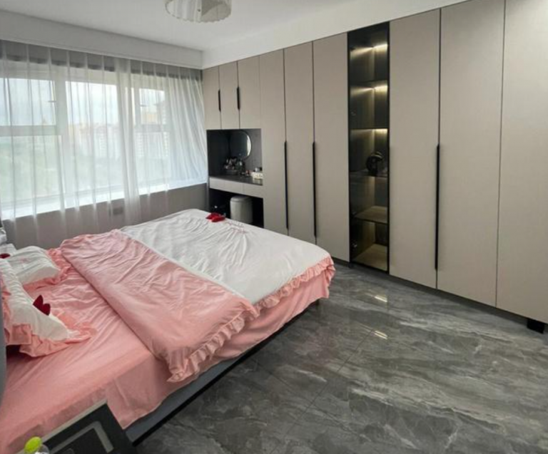 這是主臥,床尾對面的墻體設計的衣柜直接到頂,半點空間都沒有浪費。設計柜子的時候,旁邊預留了梳妝臺的位置,可以非常方便女屋主使用,大小位置合適。全屋地面選擇選擇鋪貼灰塵瓷磚,非常耐臟。