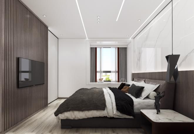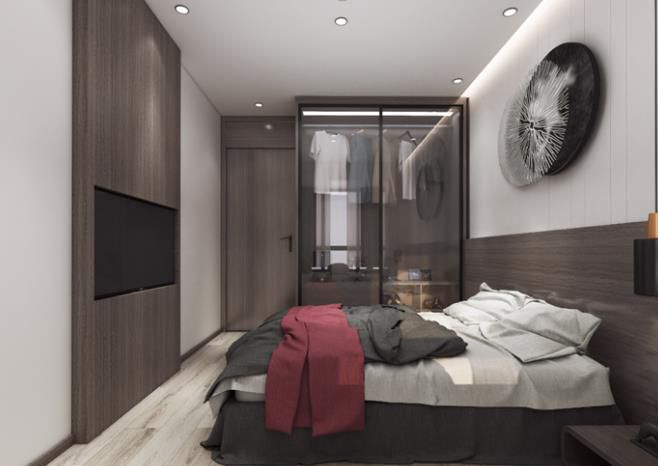 次臥搭配金屬吊燈,玻璃推拉衣柜,電視則是嵌在木飾背景上,加上吊頂?shù)狞c(diǎn)光源,將次臥的空間氛圍烘托的更加溫馨愜意。
