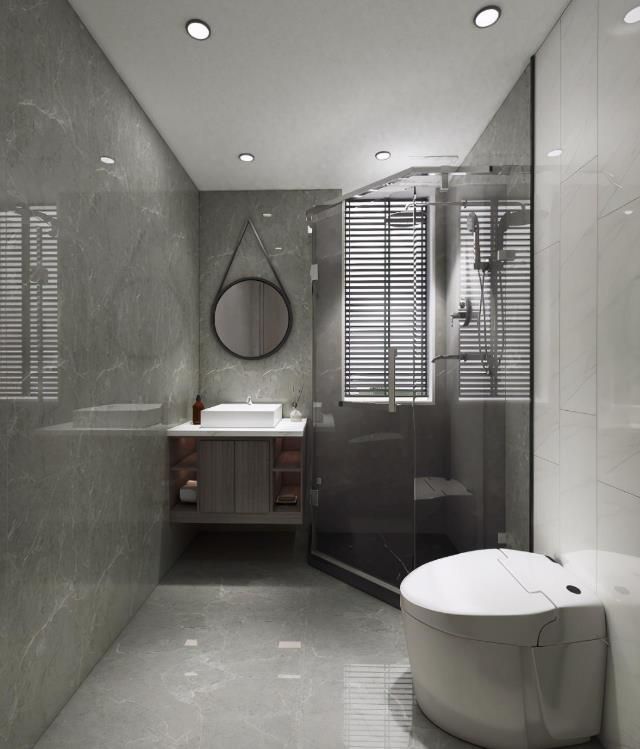 主衛(wèi)選用灰色全拋釉瓷磚進(jìn)行大面積鋪貼,小面積用白色瓷磚切割作為背景,起到整個(gè)空間的點(diǎn)睛之筆。